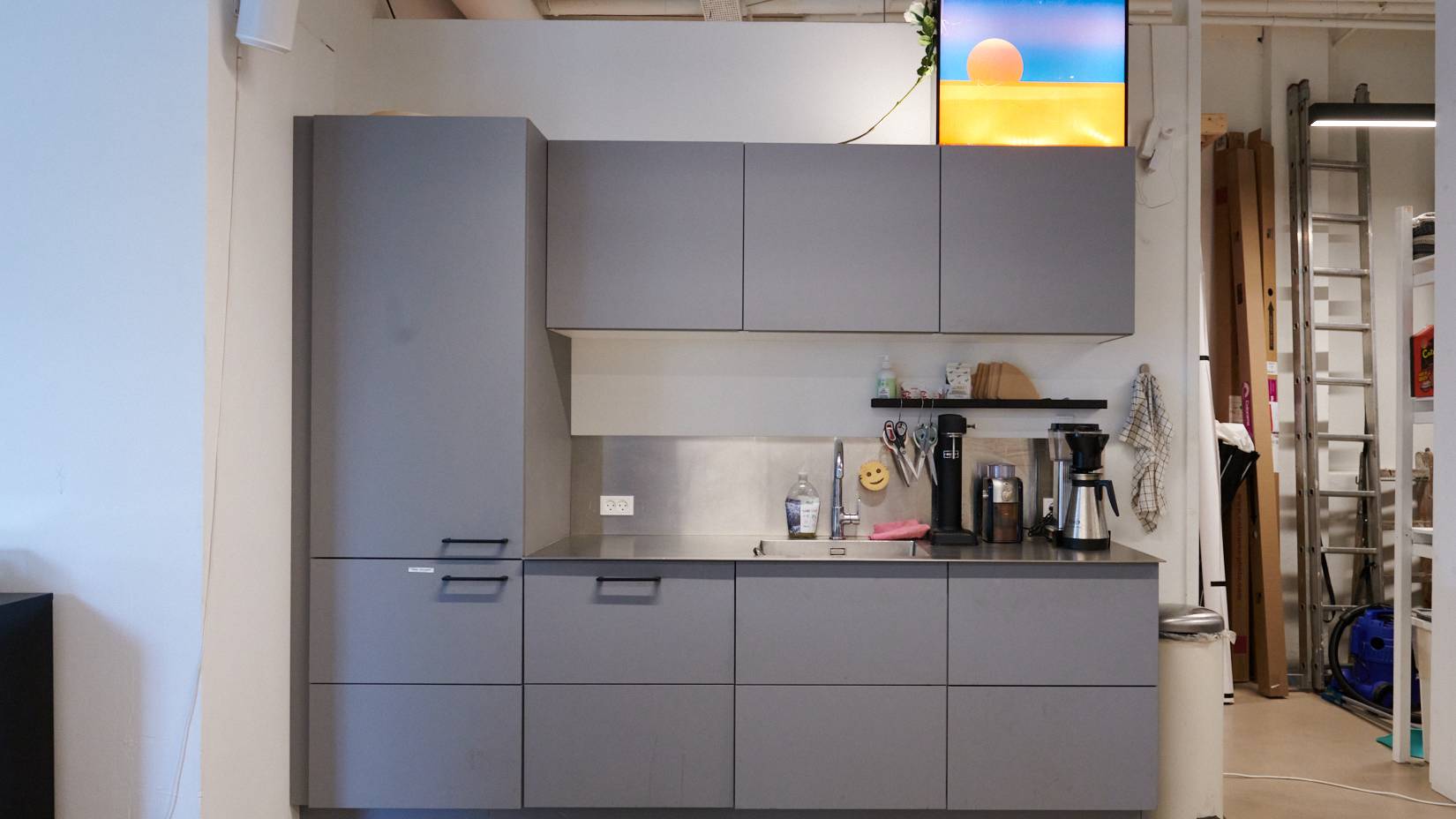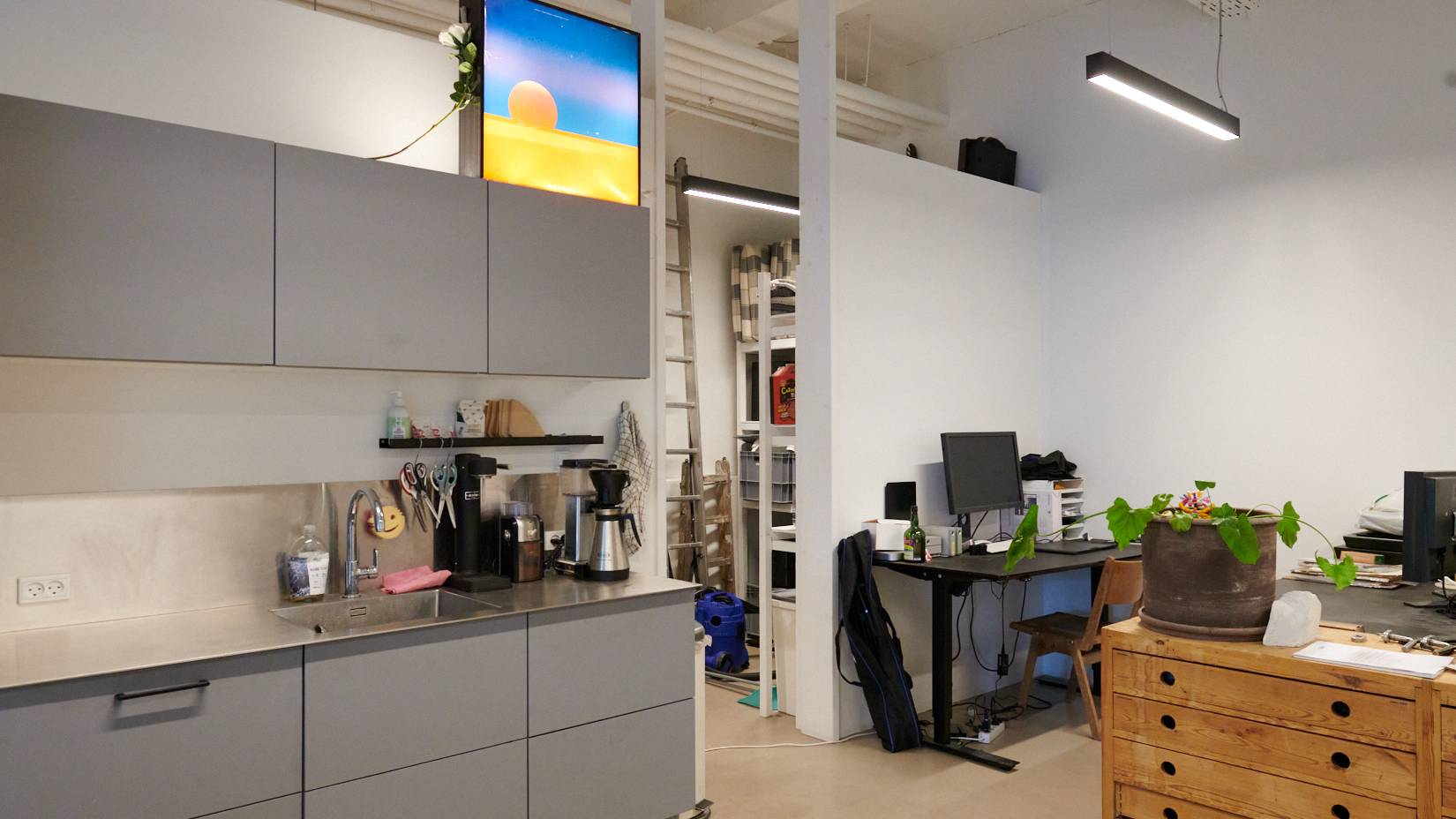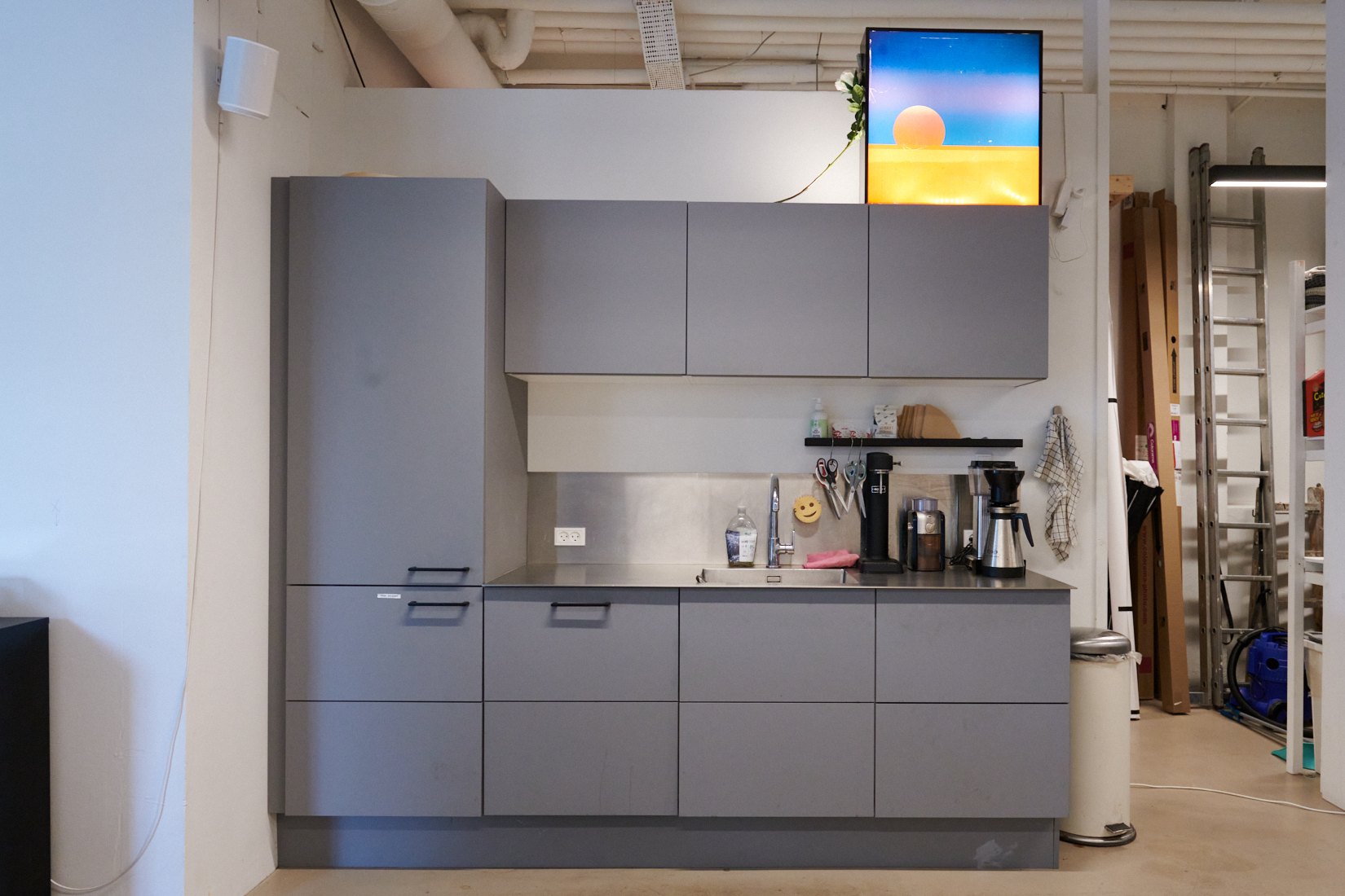 Kontoret er i dag indrettet som storrumskontor, men udlejer kan etablere et mødelokale efter behov. Bagerst findes et lyst køkken med spiseplads og et åbent depotrum til opbevaring.