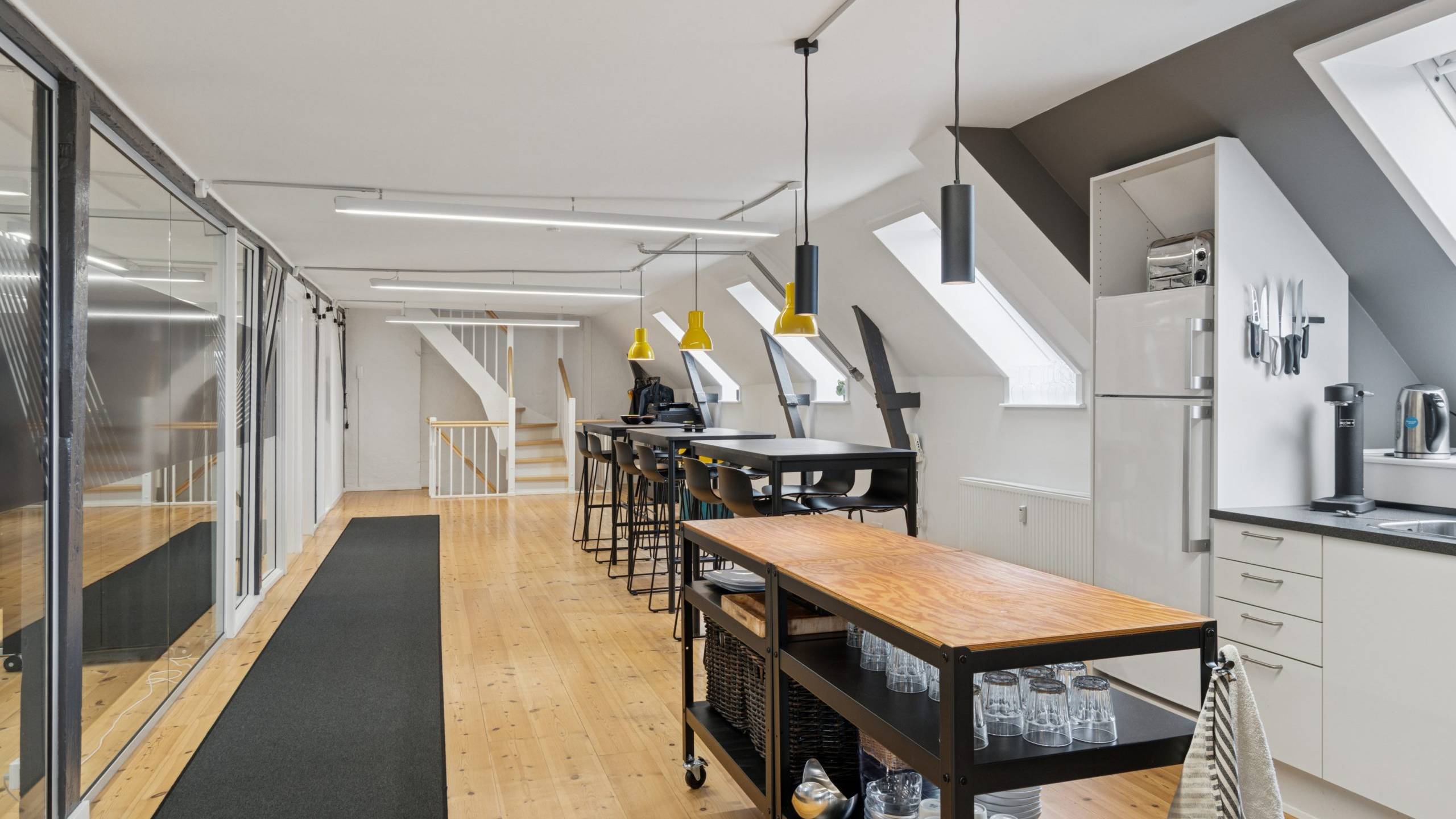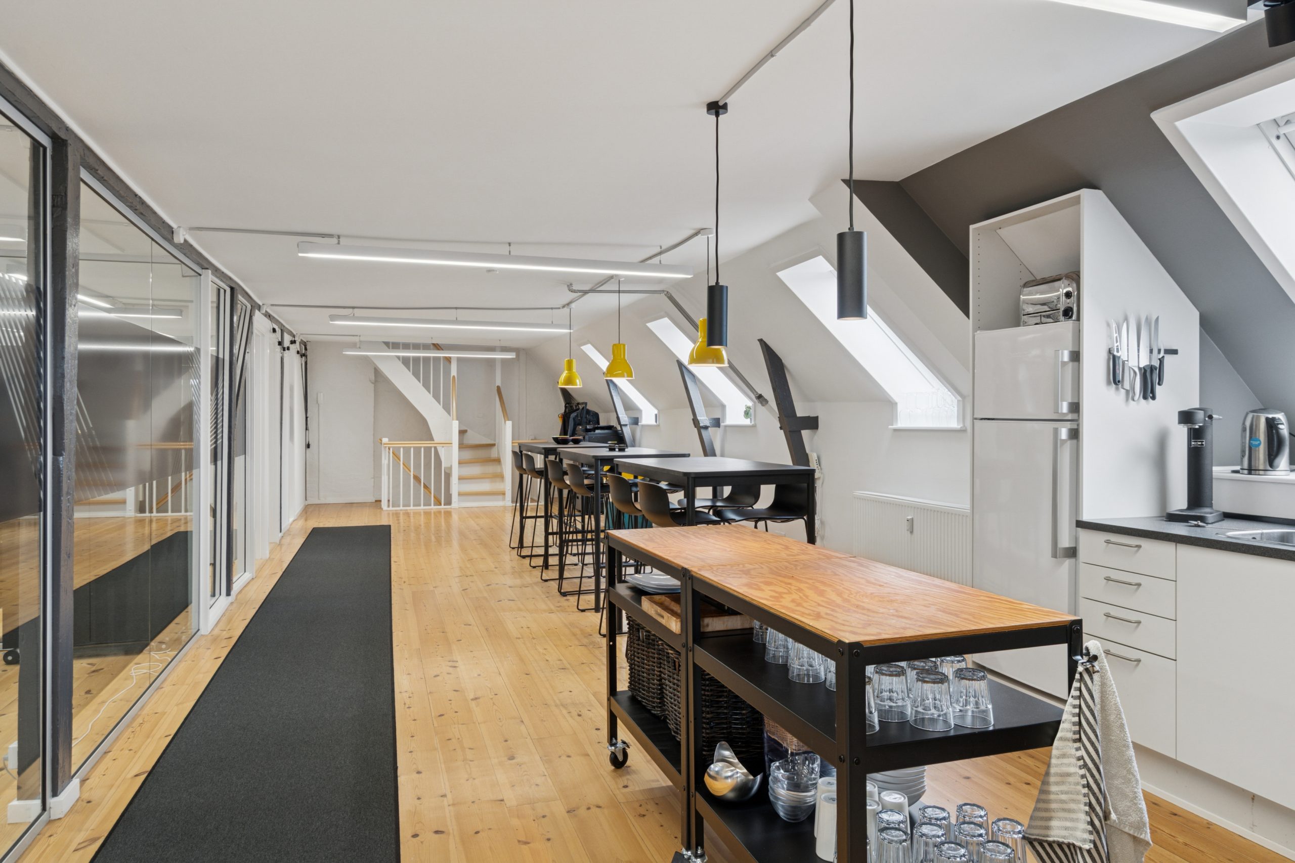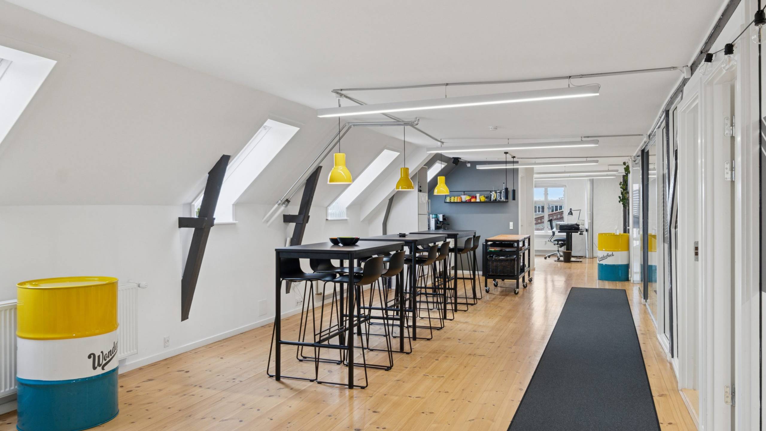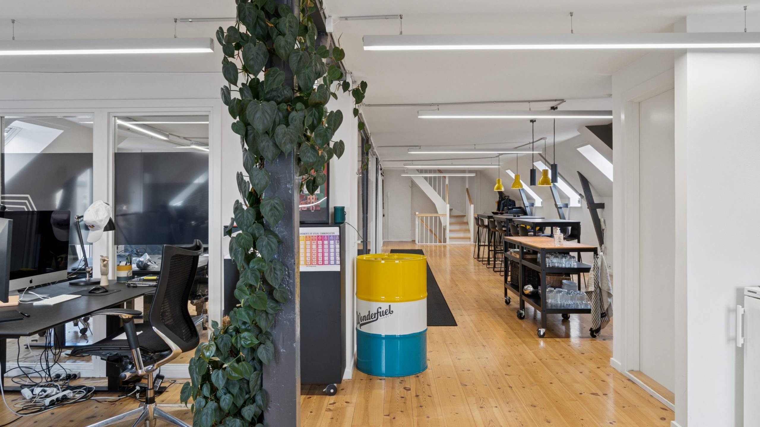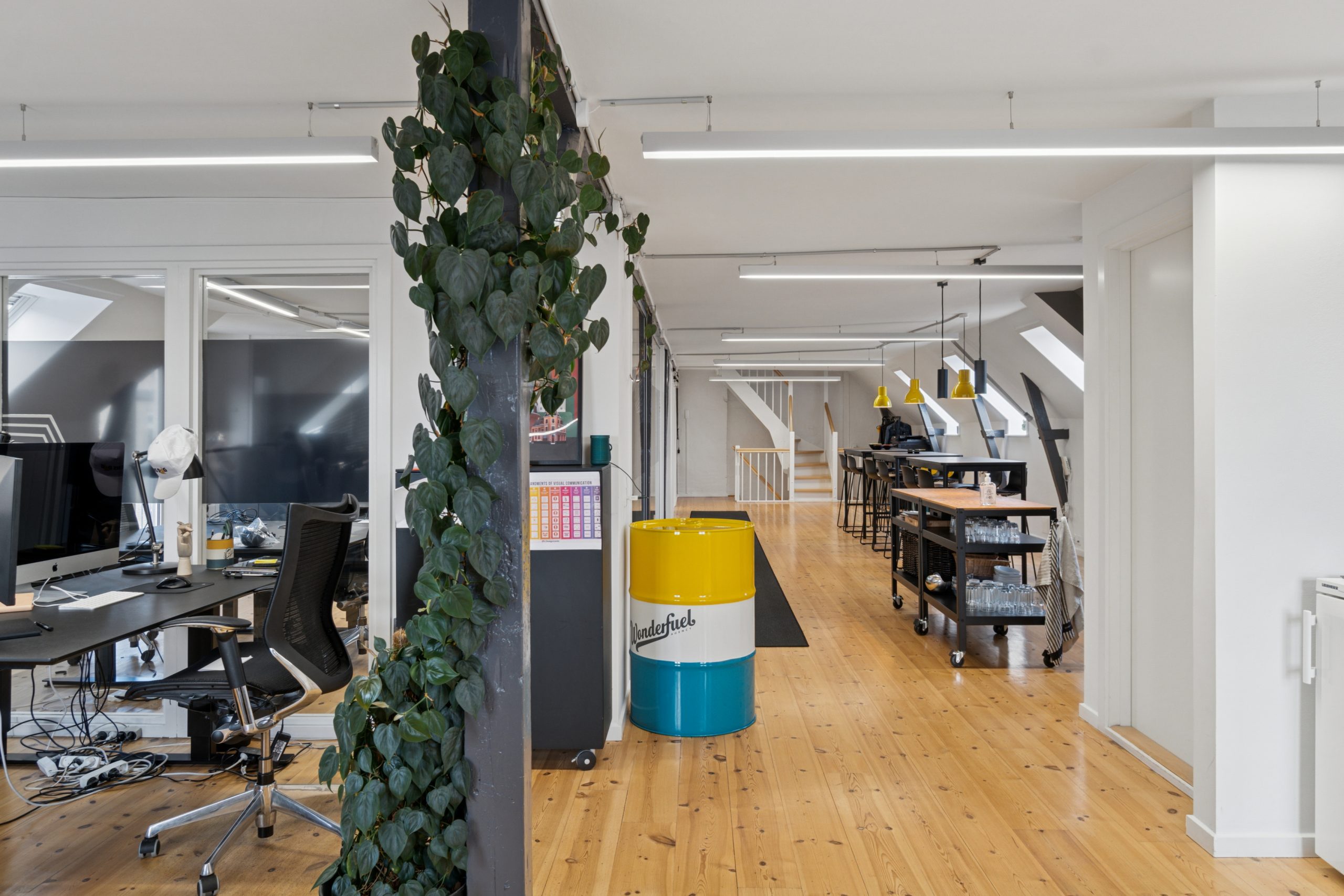 Der er en helt særlig stemning i lejemålet, der emmer af kreativitet og fordybelse på samme tid, og som med sin stilrene indretning er attraktiv for mange virksomheder inden for de kreative brancher.